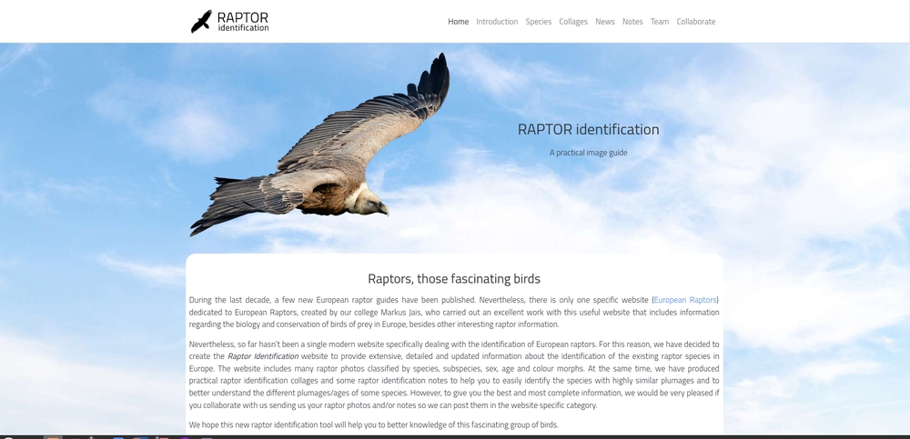 На протяжении последней декады было опубликовано несколько новых определителей хищных птиц. Однако до сих пор существовал лишь один веб-сайт, посвященный хищным птицам (European Raptors), созданный нашим коллегой Markus Jais. Маркус провел великолепную работу над этим полезным ресурсом, который включает информацию о биологии и охране хищных птиц Европы, а также другие интересные сведения о хищных птицах.